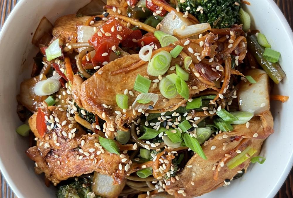 Гречневая соба с курицей и овощами — это сытное и вкусное блюдо категории Вок. В его составе обжаренная курица, богатая белком, а также гречневая лапша, брокколи, репчатый и зелёный лук, морковь, кунжут, болгарский перец и стручковая фасоль, которые делают это блюдо не только вкусным, но и полезным