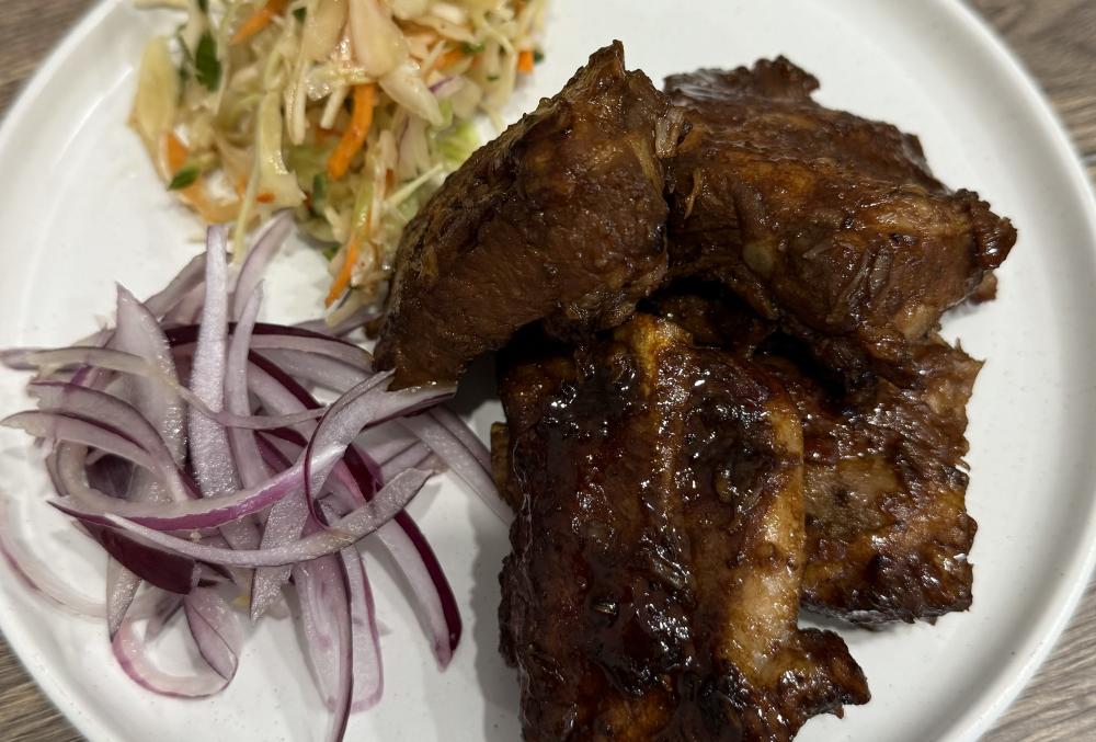 Свиные рёбрышки по Гонконгски (Ребра,салат,лук + рис 200гр)